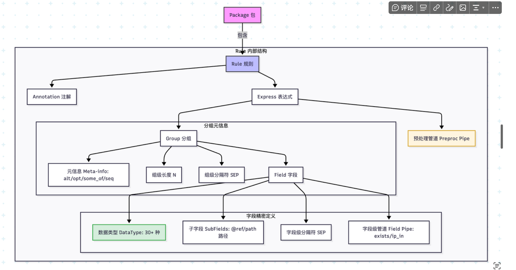 WPL 用于定义“规则(rule)”,每条规则由一个或多个“分组(group)”构成,分组内包含若干“字段(field)”抽取项。